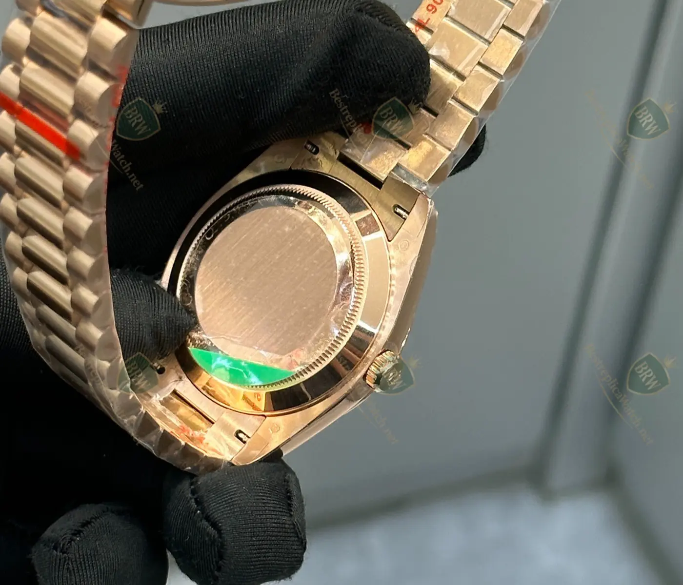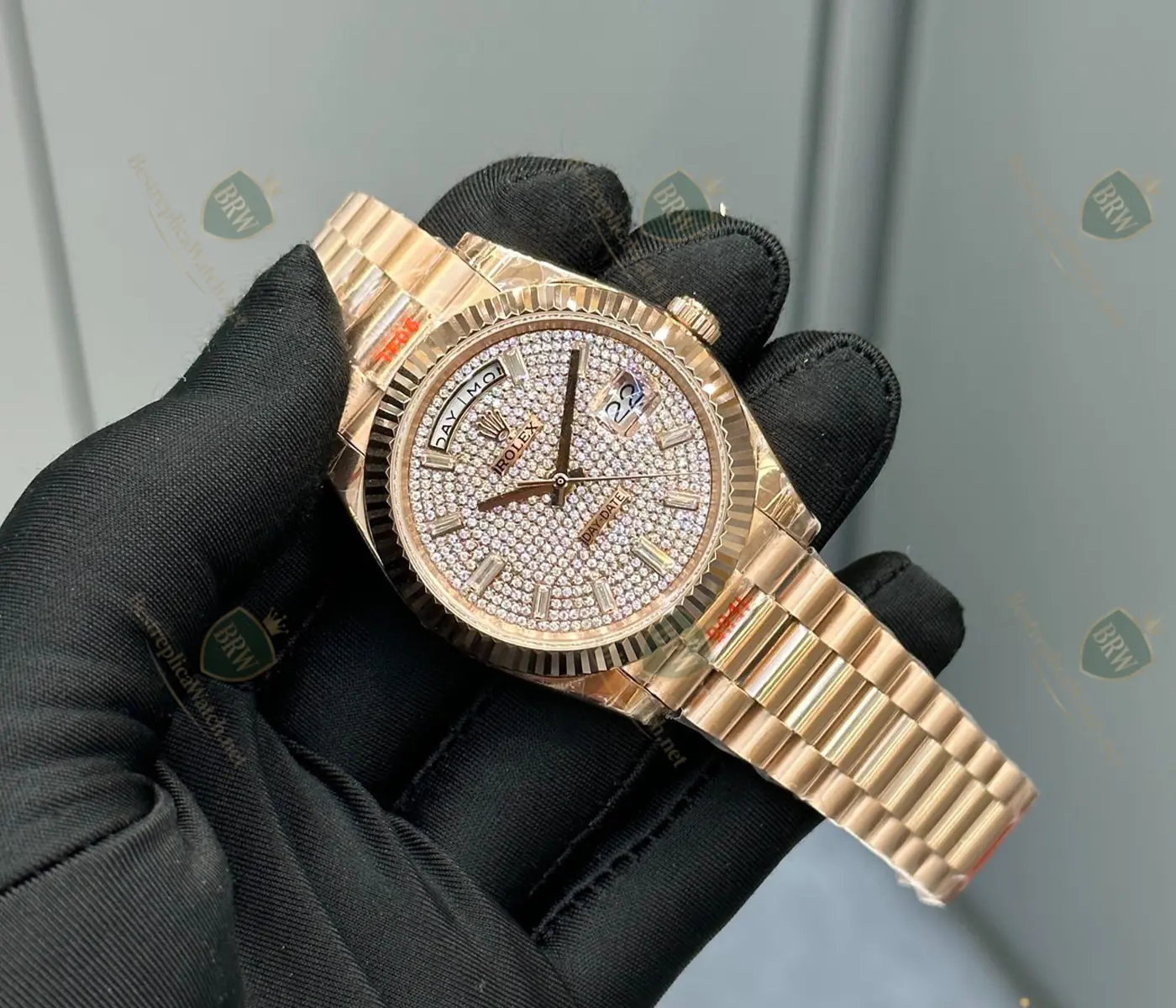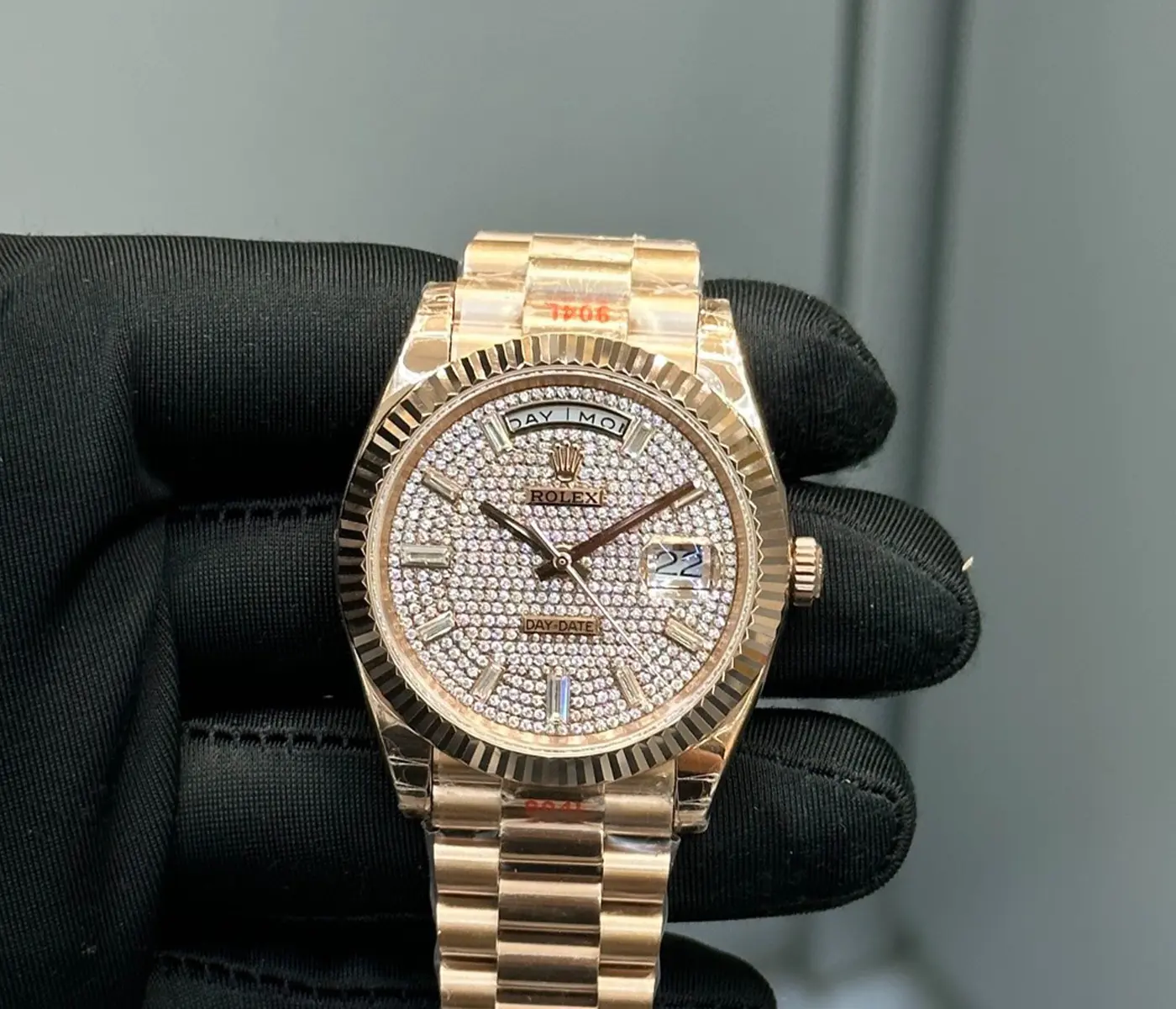 Materials: 18K Everose Gold; Fully paved diamond dial with baguette-cut markers; Fluted gold bezel; President bracelet.