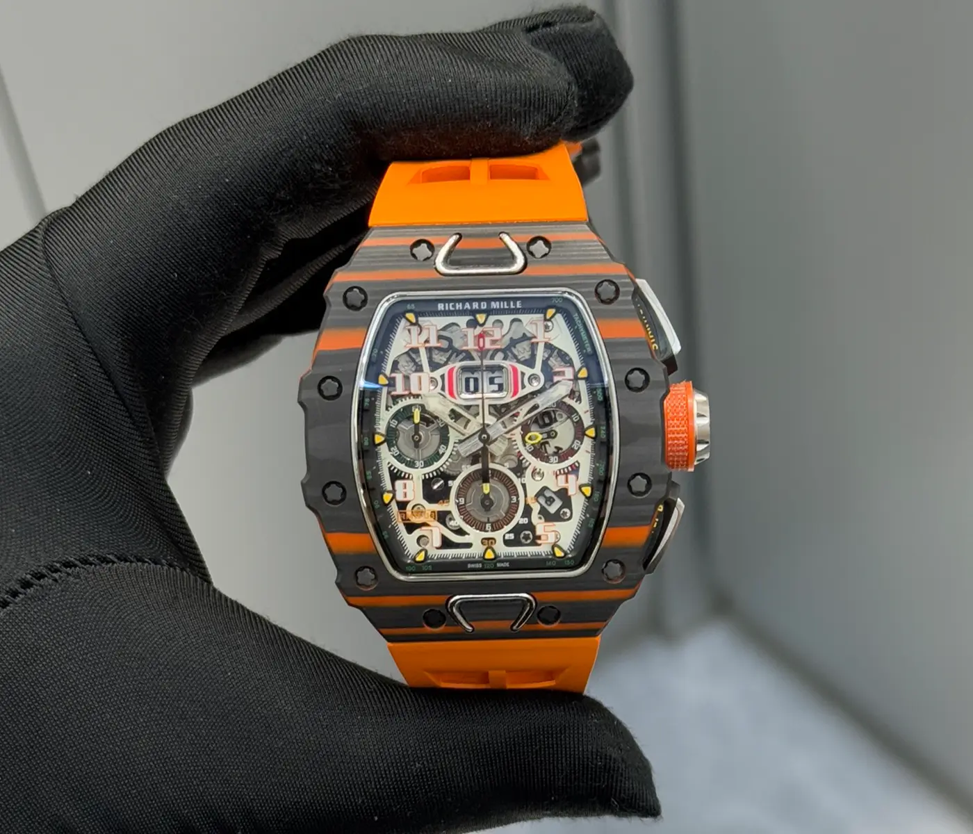Materials: Orange Quartz TPT® interwoven with Carbon TPT; McLaren signature crown and pushers.