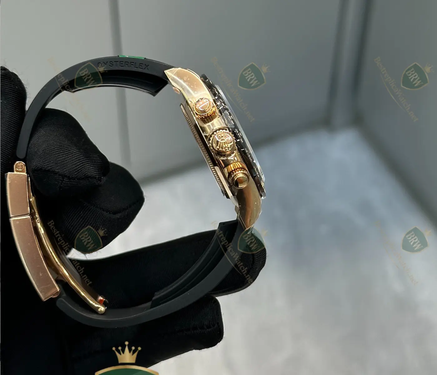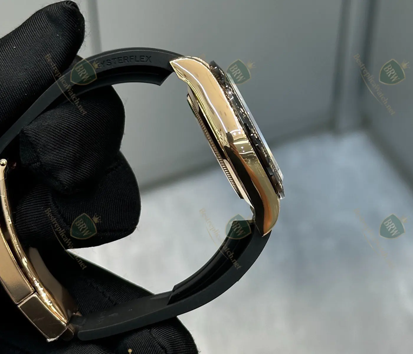 Materials: 18K Rose Gold (PVD/Wrapped); Cerachrom ceramic bezel; Oysterflex elastomer strap.