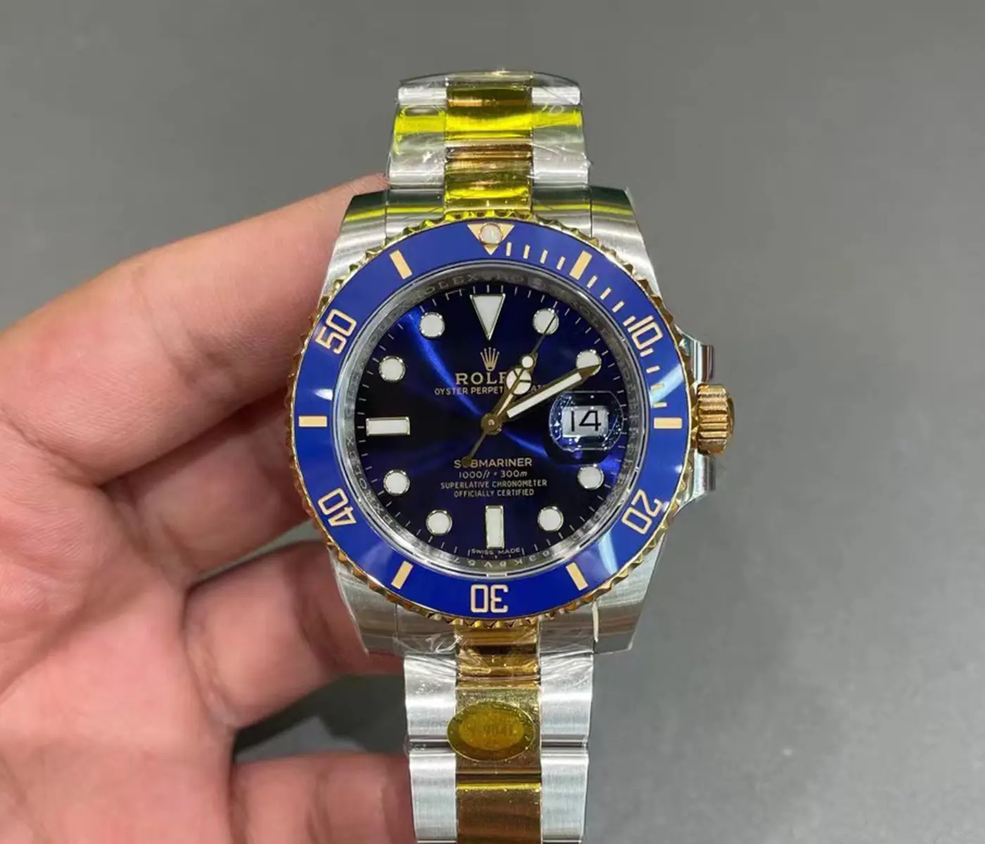Materials: 904L Stainless Steel and 18K Yellow Gold; Cerachrom ceramic bezel with gold-coated numerals; Oyster bracelet.